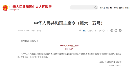 新華社北京12月27日電 全國人大常委會會議12月27日表決通過新修訂的民用航空法,自2026年7月1日起施行。 &nb...